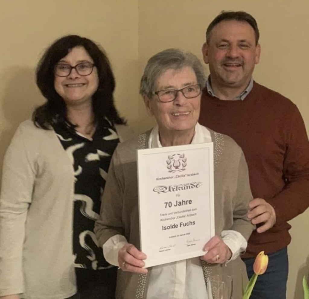Isolde Fuchs wurde für 70 Jahre Mitgliedschaft im Kirchenchor „Cäcilia“ geehrt. 65 Jahre davon war sie als Sängerin und 54 Jahre im Vorstand aktiv. Christel Bach wird in den nächsten Tagen für 60 Jahre Mitgliedschaft geehrt.