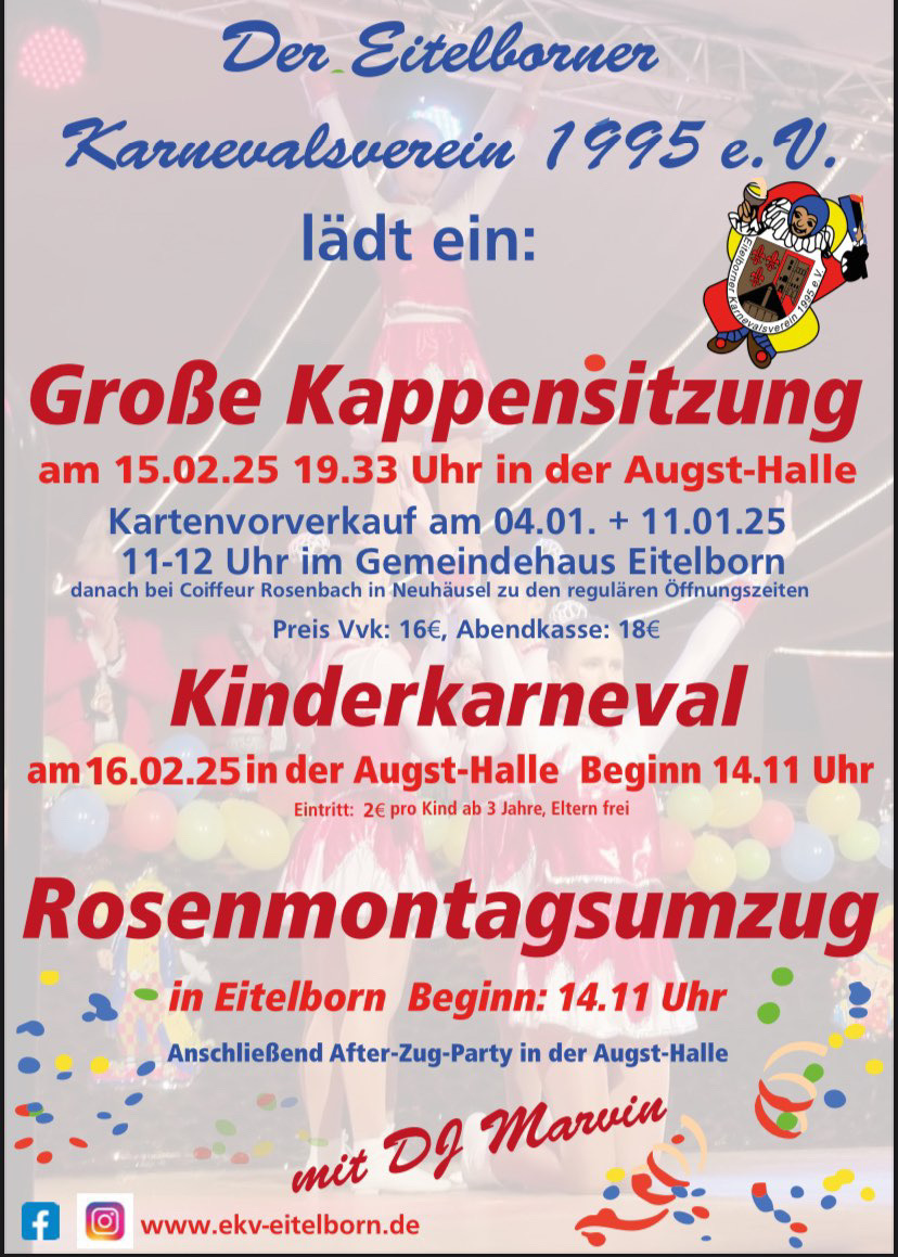 Augst-Halle Westerwaldstraße, NeuhäuselDer Eitelborner Karnevalsverein 1995 e.V. gibt den närrischen Fahrplan der Session 2025 bekannt. Einläuten wollen wir die Session 2025 mit der traditionellen “Großen Kappensitzung“ am Samstag, 15. Februar 2025, 19.33 […]