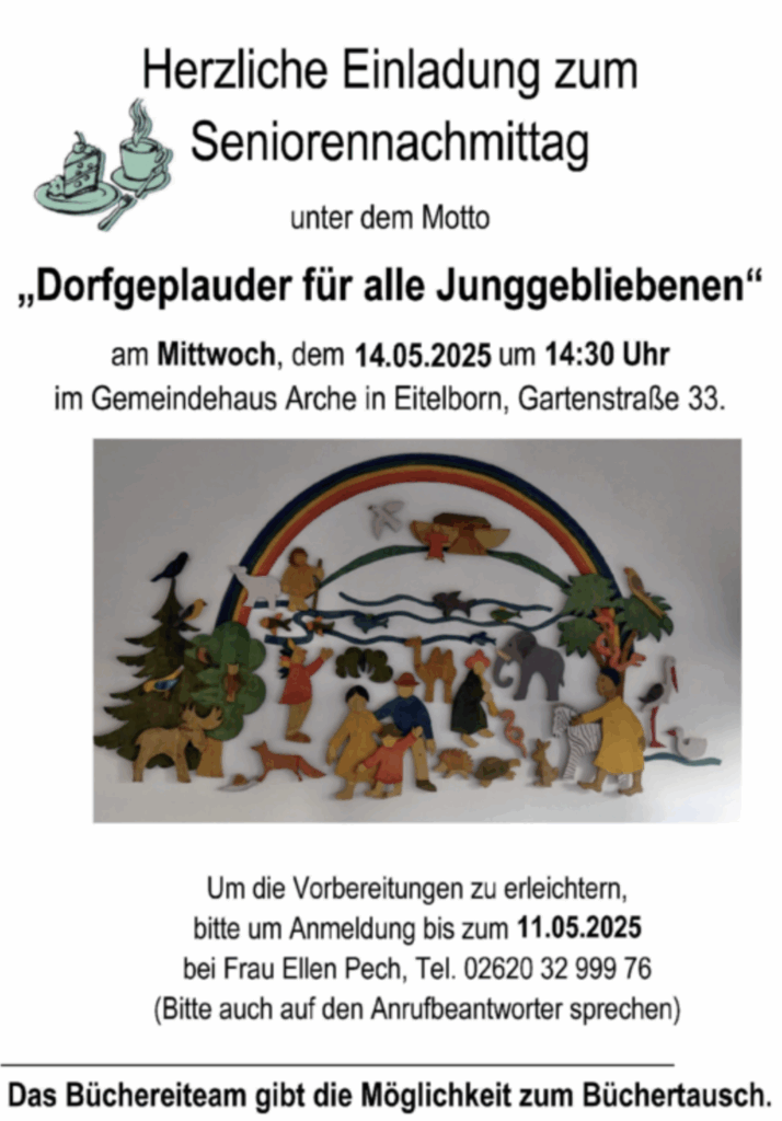 Am 09. Dez. organisiert der Frauenkreis der ev. Kirchengemeinde eine Busfahrt nach Heidelberg. Es sind noch einige Plätze frei. Kosten: 40,00 Euro. Infos und Anmeldung bei Brigitte Kopold, 02620/2608 (auch AB)
