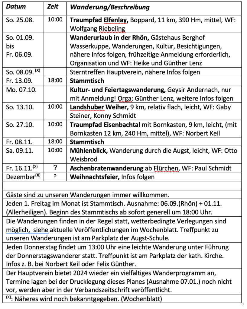 Jeden 1. Freitag im Monat ist Stammtisch. Ausnahme: 06.09.(Rhön) + 01.11. (Allerheiligen). Beginn des Stammtischs ab sofort generell um 18:00 Uhr.Die Wanderungen – im Kalender veröffentlicht – finden in der Regel statt, wetterbedingte Verlegungen sind möglich, siehe aktuelle Veröffentlichungen im Wochenblatt. Treffpunkt zu unseren Wanderungen ist am Parkplatz der Augst-Schule.