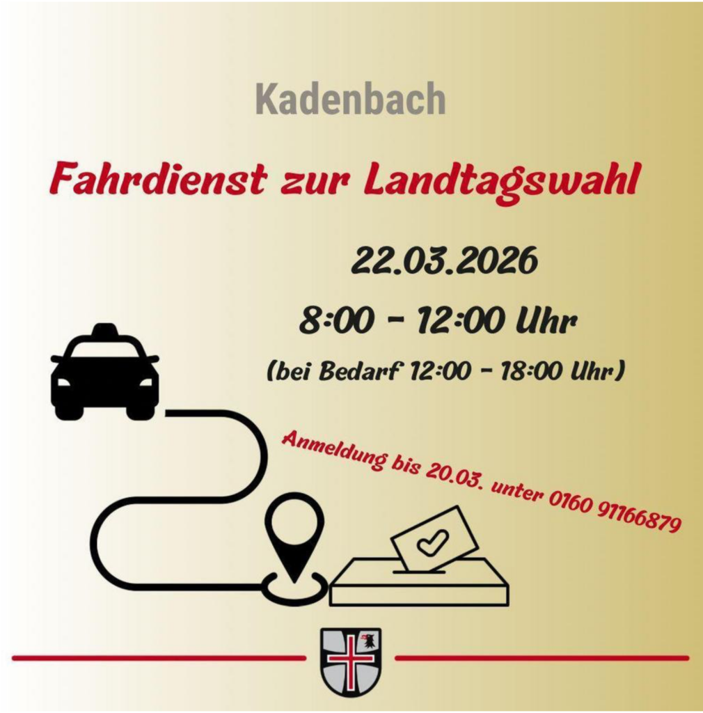 Am 22.03.2026 findet die Landtagswahl in Kadenbach in der Aussegnungshalle statt. In diesem Jahr können wir mit unserem Dorfmobil und ehrenamtlichen Fahrern einen individuellen Fahrdienst zum Wahlort und nach Hause anbieten.