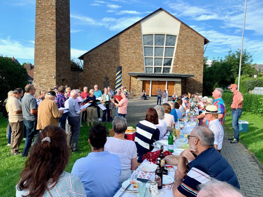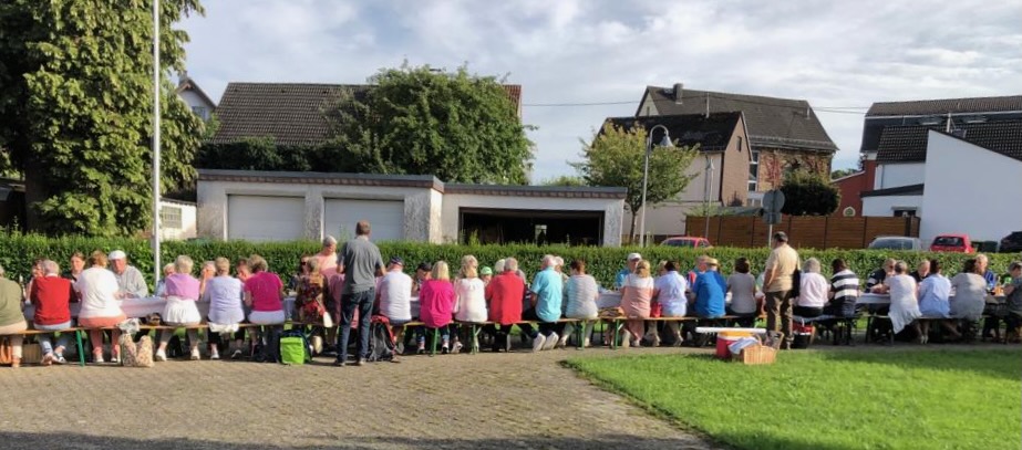 Das erste Dorfplatzfest vor der katholischen Kirche in Neuhäusel fand am letzten Samstag zum Ende der Sommerferien bei strahlendem Sonnenschein statt. Der Vereinsring hatte eingeladen. Anfänglich wurden zehn Biertischgarnituren aufgestellt. Vielleicht ist das schon zu viel? Gegen 17:00 Uhr kamen die ersten Gäste, mit Essen und Trinken gut ausgestattet. Noch wurden die schattigen Plätze bevorzugt. Und dann füllten sich die Tische und am Ende wurden alle 17 Tische aufgebaut, die zur Verfügung standen. Gute 110 Teilnehmer konnten gezählt werden, die an einem langen Tisch saßen und sich gegenseitig ihr Essen anboten.