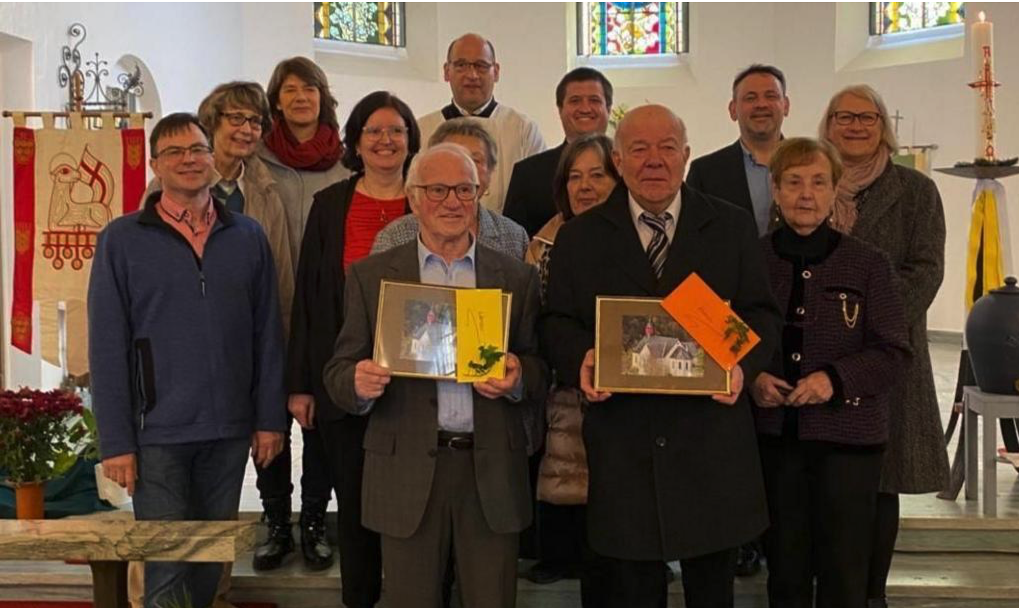 Als Ausdruck der Dankbarkeit und Anerkennung für ihren jahrzehntelangen Dienst für den Kirchort Arzbach übereichte Hedi Hutter den Beiden ein Präsent mit einem Foto der Kirche. Abschließend stellten sich noch einige Mitglieder des Ortsausschusses, zusammen mit den beiden Geehrten und Pfarrer Henrich, zu einem Erinnerungsfoto zusammen.