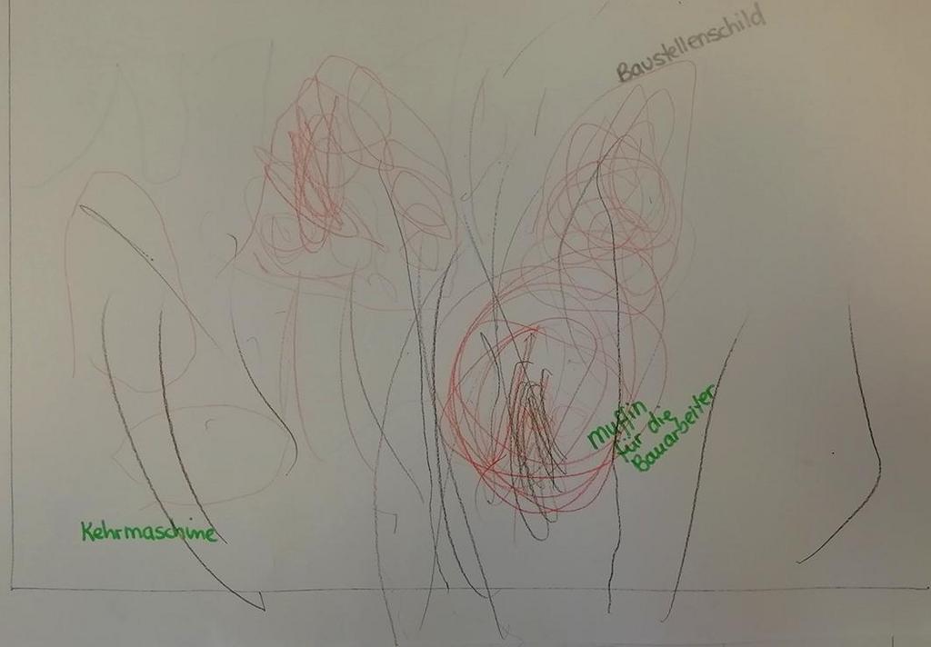 Dabei sind kreative Kunstwerke entstanden, die dann im Stuhlkreis präsentiert wurden. Die kleinen Künstler haben Baustellenfahrzeuge und Werkzeug gemalt. Aber auch die Dixi-Toiletten wurden bedacht und sogar Muffins für die Mittagspause der Bauarbeiter. Die Kinder sind gespannt, wie es mit dem Umbau weiter geht und werden jeden Schritt genau beobachten.