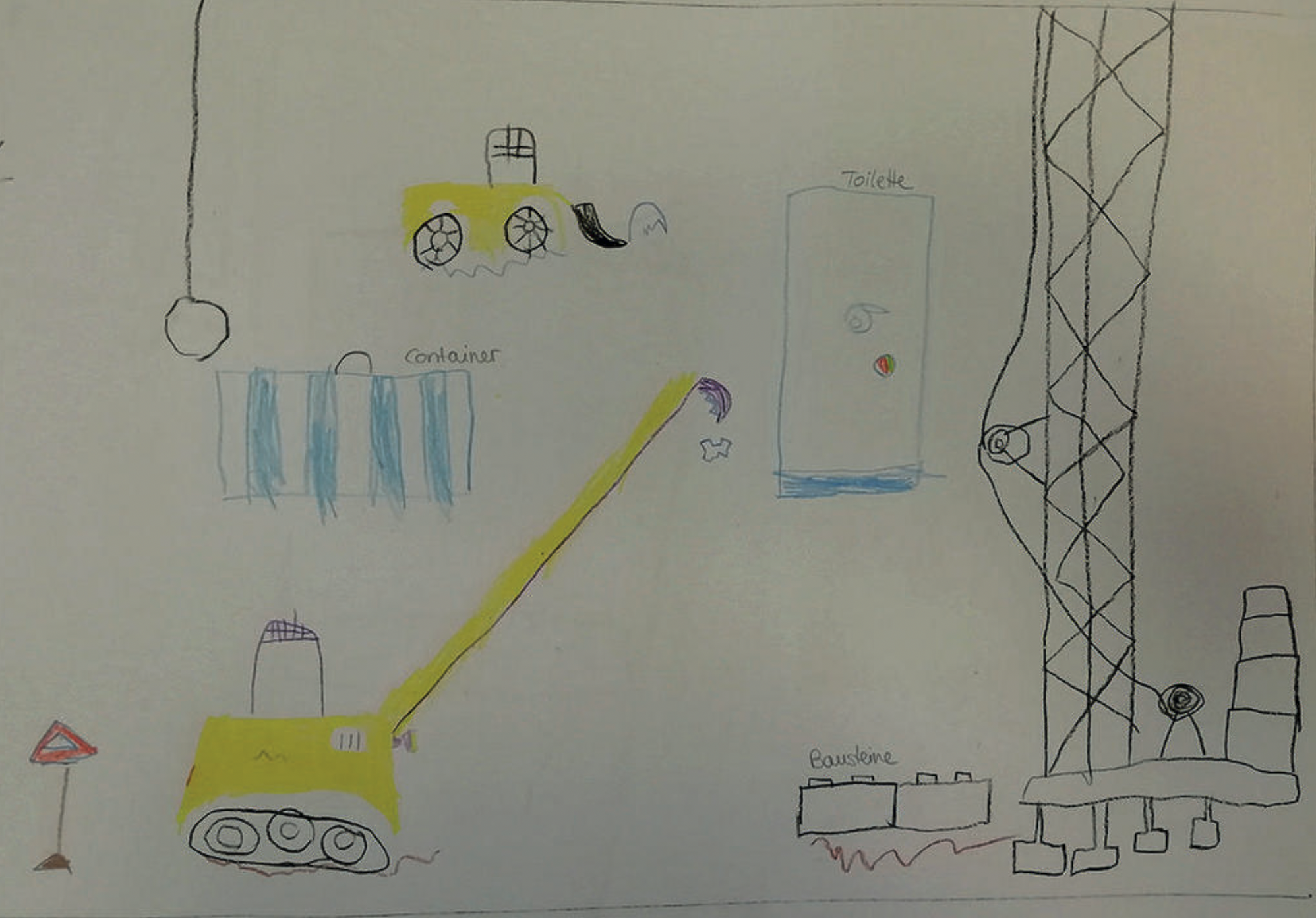 Der Umbau der Kita ist für die Kinder sehr interessant. Gespannt verfolgen sie, wenn sich auf der Baustelle etwas tut. Sobald der große Kran sich bewegt, drücken sie ihre kleinen Nasen an der Fensterscheibe platt. Das haben die Erzieher/innen zum Anlass genommen, um näher auf das Thema Baustelle einzugehen. Neben einem Bewegungsspiel und einem Baustellenlied haben die Kinder Baustellenbilder gemalt.
