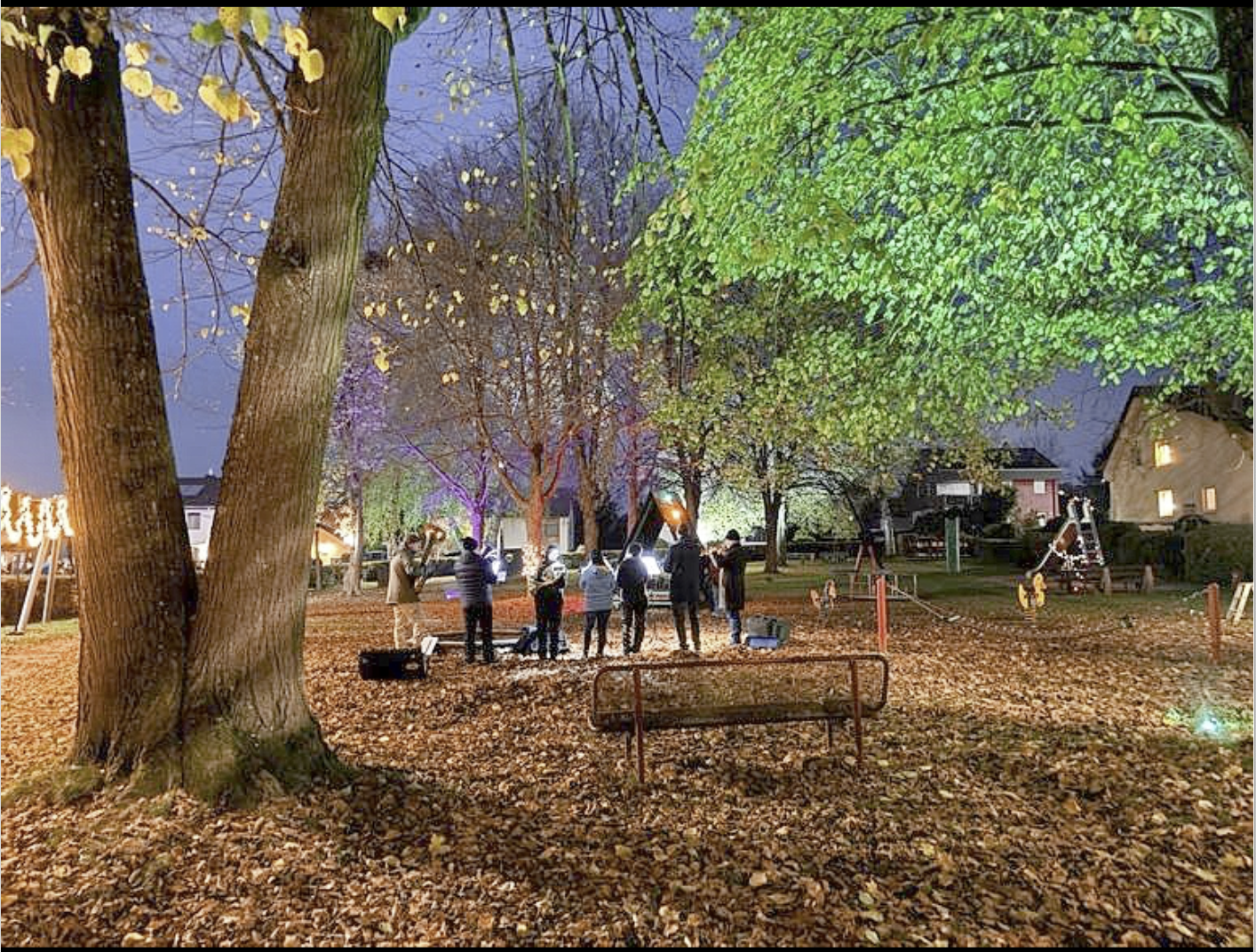 Im Anschluss startete in der Gartenstraße der Umzug, der von Sankt Martin auf seinem Pferd angeführt und von unserer freiwilligen Feuerwehr, die den Weg mit Fackeln ausleuchteten, begleitet wurde. Eine bunte Laternenschar bewegte sich durch die Coermannstraße und die Straße Im Windegut, vorbei an den mit viel Liebe beleuchteten Häusern. Die Wegstrecke wurde in diesem Jahr erweitert und ein zusätzliches Highlight am Spielplatz eingebaut. Die Projektgruppe Neuhäusel 2030 hatte den Spielplatz geschmückt und illuminiert. Passend zum Lichtermeer spielte der Posaunenchor Martinslieder.