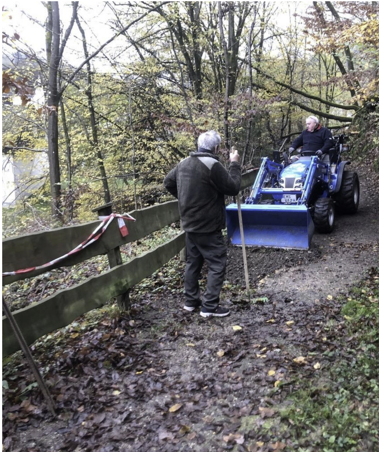Auch musste noch eine Gefahrenstelle verfüllt werden. Hier war der Weg, von einem durch Schneebruch ausgehebelten Baum, halbseitig zerstört. Da dieser Zustand kurz vor seinem „einjährigen Jubiläum“ steht, wollte man hier ein Zeichen setzen. Auf Anweisung unseres Ortsbürgermeisters brachten die Gemeindearbeiter das notwendige Füllmaterial vor Ort. Eine direkte Anfahrt mit dem Gemeindetraktor war leider nicht möglich, da weitere umgefallene Bäume den Weg höhenmässig blockieren. Die restlichen Arbeiten wurden mit unserem Vereinstraktor und entsprechender Handarbeit erledigt. Der Vorstand bedankt sich nochmals bei allen Helfern.