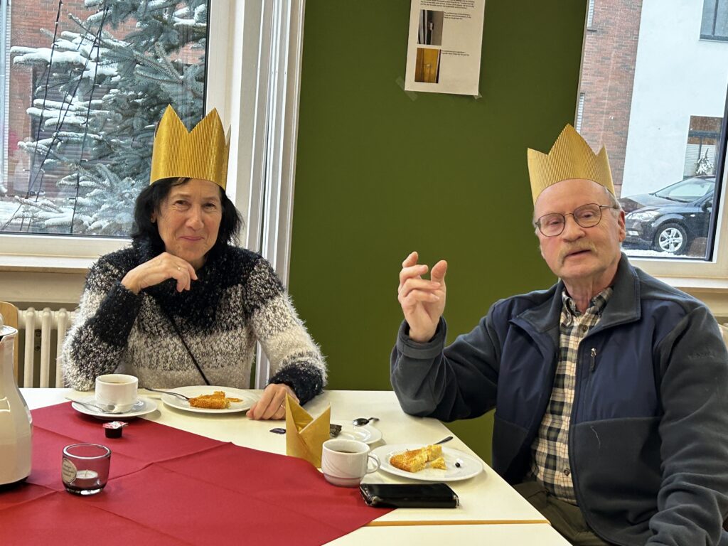 An jedem der vier mit einem Galette versehenen Tisch durfte die glückliche Person, die in ihrem Kuchenstück eine „Bohne“ fand, sich zum König*In krönen lassen und einen Konsorten aussuchen.