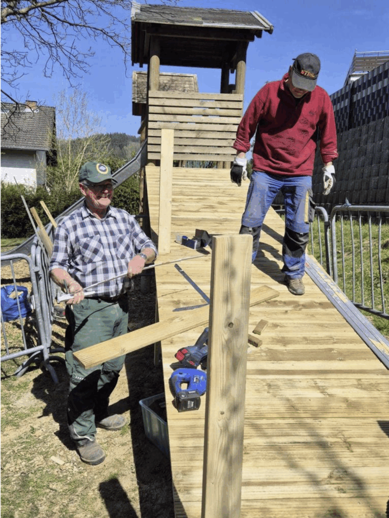Nach den Arbeiten im Bereich des Sandkastens, war jetzt die Renovierung des Kletterturms mit Rutsche angesagt. Ein Zugang zur Rutsche wurde neu aufgebaut. Der alte Zugang war schon längere Zeit amtlich gesperrt!