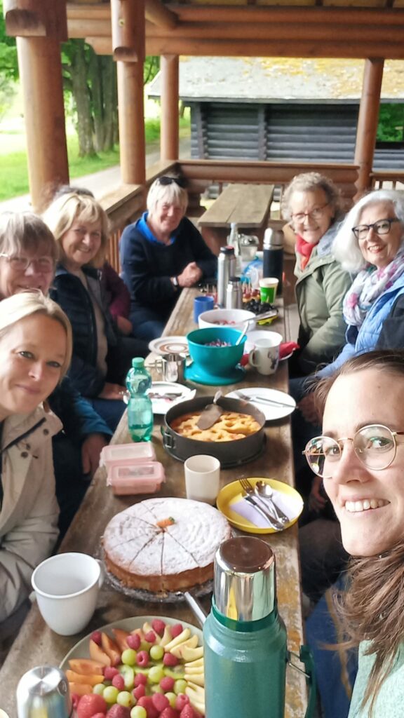 Zum diesjährigen Picknick trafen sich heute , Dienstag um 14 Uhr 11 Bücherliebhaberinnen an der Kadenbacher Hütte. Es wurden Salate, Kuchen , Brot und jede Menge Früchte aufgetischt.