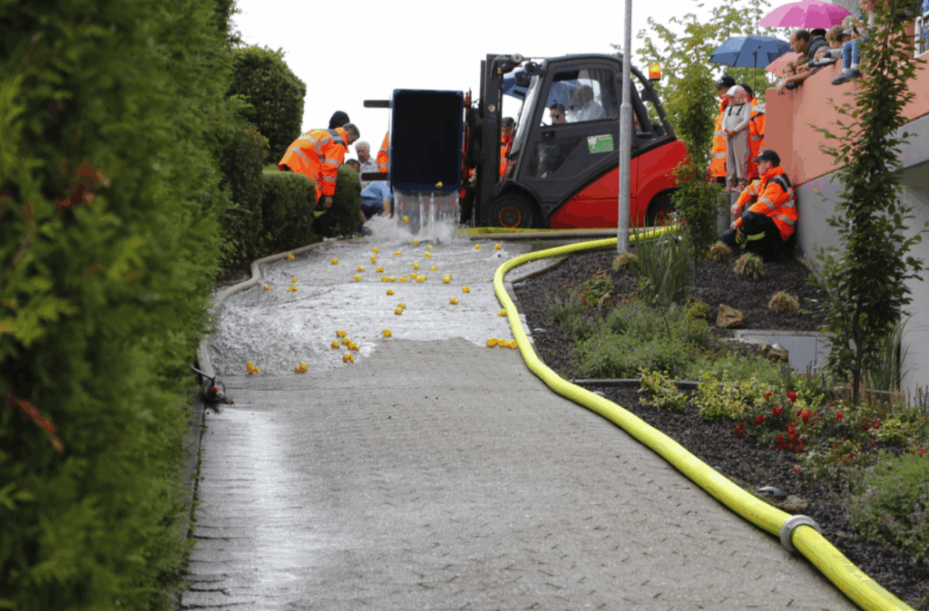 Einer der unbestrittenen Höhepunkte war das traditionelle Entenrennen, das auch in diesem Jahr wieder für große Begeisterung sorgte. Der spannende Wettkampf der gelben Schwimmer begeisterte Klein und Groß und sorgte für ausgelassene Stimmung entlang des künstlichen Bachlaufs.