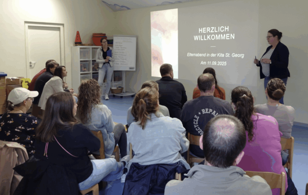 Am 11.09.2025 fand in der Kita St. Georg ein Elternabend mit dem Schwerpunkt der pädagogischen Arbeit in den Regelgruppen statt. Zuvor fand im Mai ein Elternabend für die Eltern der U3-Gruppe statt, bei dem die pädagogische Arbeit in dieser Gruppe im Mittelpunkt stand. Zu dem aktuellen Elternabend, wurden alle Eltern der Kita eingeladen, da auch die jährliche Wahl des neuen Elternausschusses stattgefunden hat. Wir freuen uns darüber, dass der Elternausschuss auch in diesem Jahr voll besetzt werden konnte!