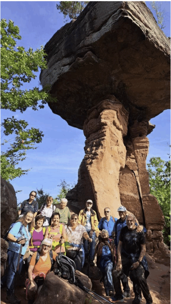 Am nächsten Morgen ging es frisch gestärkt zu unserer Altschlossfelsenwanderung ab dem Spießweiherparkplatz mit kurzem Abstecher nach Frankreich. Unser Wolfgang Riebeling, der ebenfalls dort unten mit seiner Frau im schönen Ludwigswinkel Urlaub machte, hatte sich dankenswerterweise bereit erklärt uns zu führen obwohl die Strecke ebenfalls Neuland für ihn war. Die Mühen der Wanderung mit 11 km und 420 Höhenmetern wurde durch fantastische Felsformationen und Ausblicke belohnt.