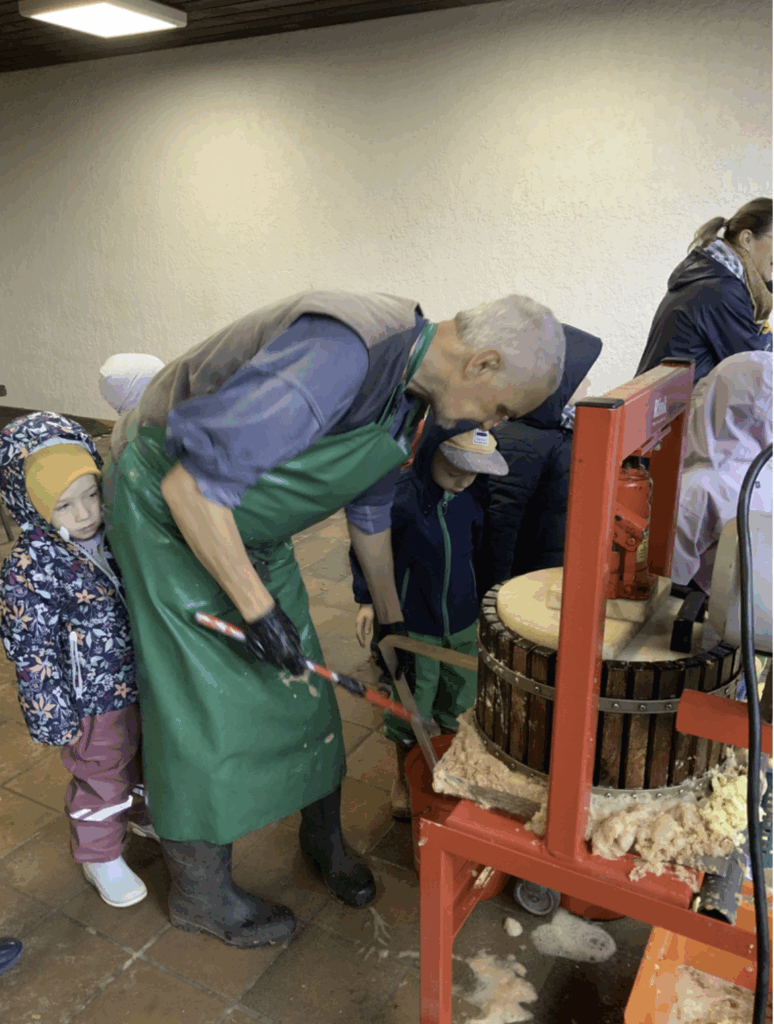Die Kinder, Erzieherinnen,Eltern und Großeltern der Kita Abenteuerland in Simmern waren in den letzten Tagen viel mit dem Ernten unserer Äpfel beschäftigt. Am 07.10.2025 besuchte uns Herr Jacobs und Herr Musil mit einer Apfelpresse. Die Kinder konnten beim Waschen der Äpfel und beim Befüllen der Apfelpresse tatkräftig unterstützen. Es war für alle sehr interessant zu erleben, wie Apfelsaft entsteht. Natürlich durfte der Saft im Anschluss auch probiert werden und der Apfelsaft konnte käuflich erworben werden. Der Erlös daraus kam dem Förderverein der Kita zugute.