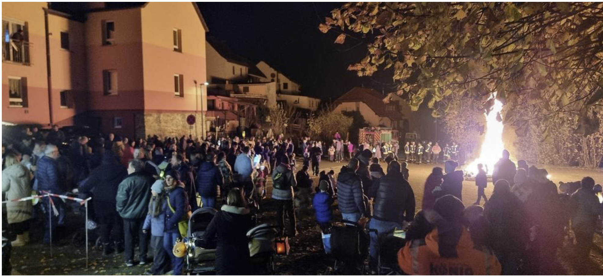 Am Kirmesplatz angekommen brannte das Martinsfeuer hell und diente als zentraler Treffpunkt. Die Menschen versammelten sich um das Feuer. Insbesondere die Martinsbrezeln fanden großen Anklang bei den Kleinsten. Die Atmosphäre war entspannt und gesellig, man blieb länger, um sich auszutauschen und den Abend gemeinsam zu genießen.