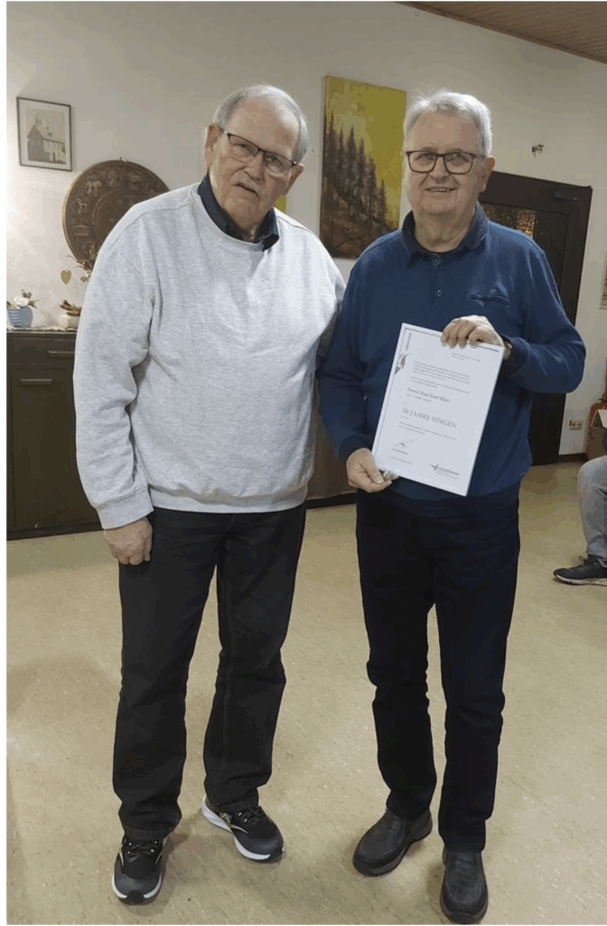 Für 50 Jahre Singen im Chor erhielt Hans Josef Blatt, erster Vorsitzender vom MGV „Cäcilia“ Arbach, zu Beginn der Chorprobe am 19. November eine Urkunde sowie eine Ehrennadel. Die Gratulation übernahm der zweite Vorsitzende des Vereins, Dieter Hand und wünschte dabei dem zu Ehrenden weiterhin viel Freude am Chorgesang. Den Wünschen schloss sich der erste Vorsitzende vom MGV „Lyra“ Kadenbach an.
