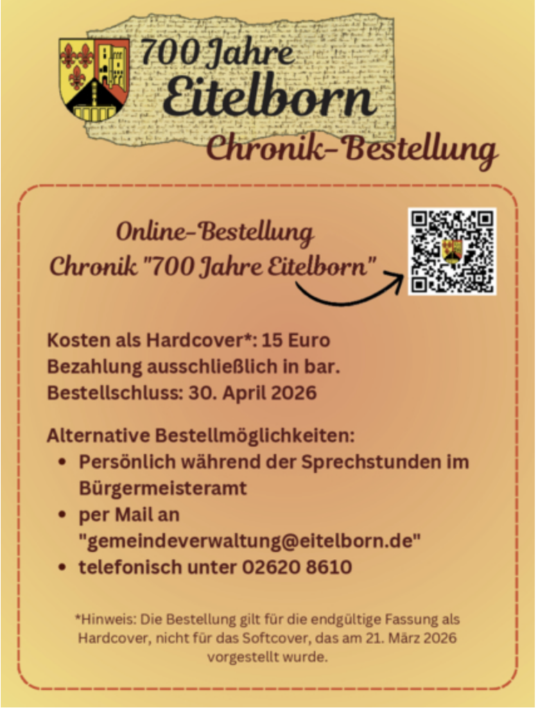 Mit der Veröffentlichung der Ortschronik liegt nun eine fachlich fundierte Darstellung der Geschichte Eitelborns vor, die einen wichtigen Beitrag zur Dokumentation und Bewahrung unseres lokalen Erbes leistet.