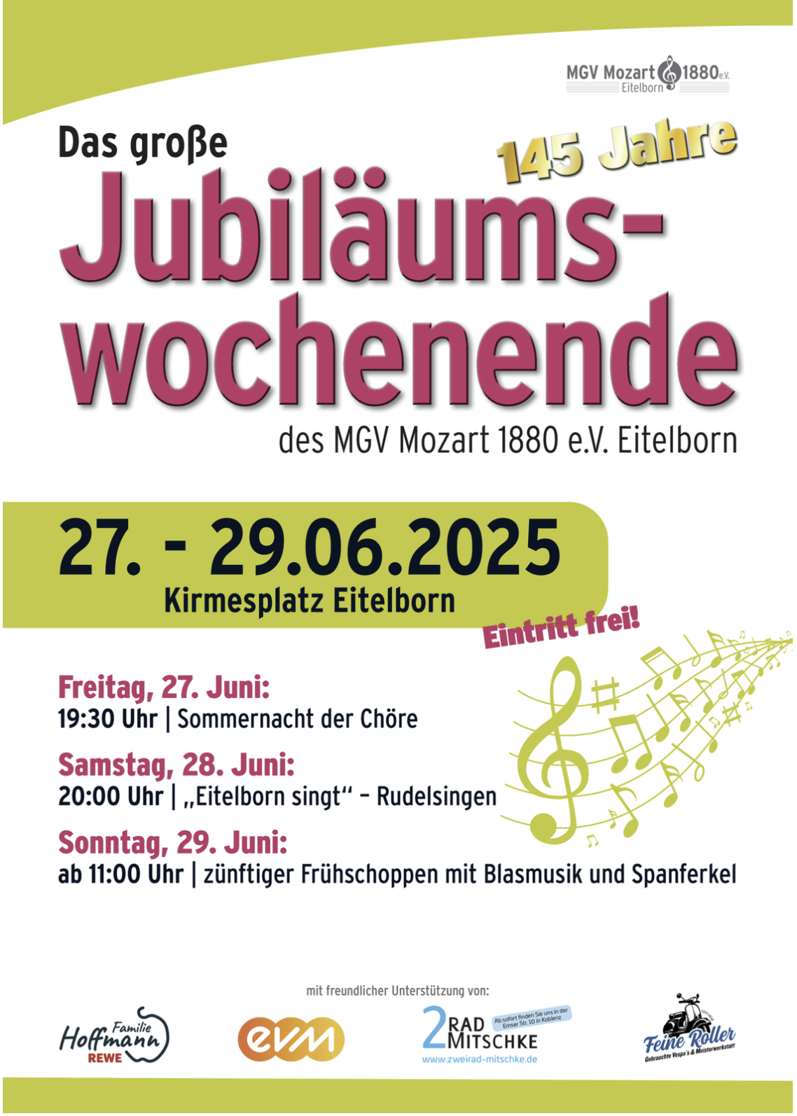 Unser Jubiläumswochenende rückt immer näher. Vom 27. bis 29. Juni feiern wir unser 145- jähriges Bestehen mit einem großen Fest auf dem Dorfplatz in Eitelborn.
