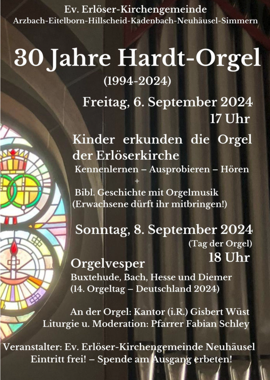 Zu dieser Orgelvesper, die um 18:00 Uhr beginnt, laden wir Sie, Kirchenvorstand und Pfarrer, von Herzen ein. Wir freuen uns, mit Ihnen zu feiern!