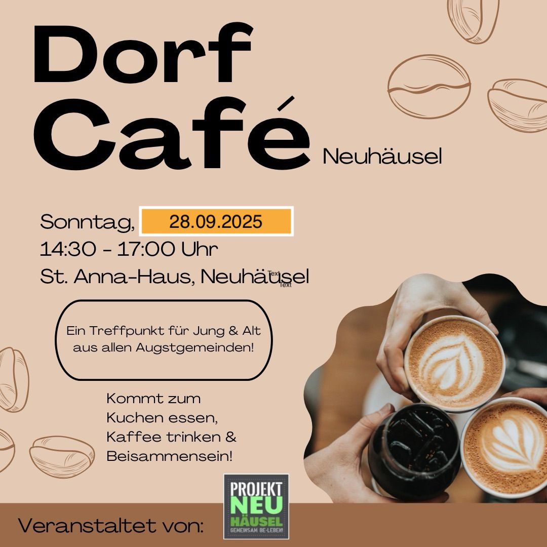 Das Dorf Café im St. Anna-Haus in Neuhäusel am Sonntag, den 28.09.2025, bietet von 14:30 bis 17:00 Uhr wieder eine gemütliche Gelegenheit, Kaffee und Kuchen zu genießen. Es soll ein Ort, für ein entspanntes Beisammensein, für jung und alt sein.