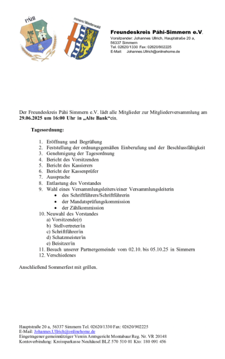 Der Freundeskreis Páhi Simmern e.V. lädt alle Mitglieder zur Mitgliederversammlung am 29.06.2025 um 16:00 Uhr in „Alte Bank“ ein.