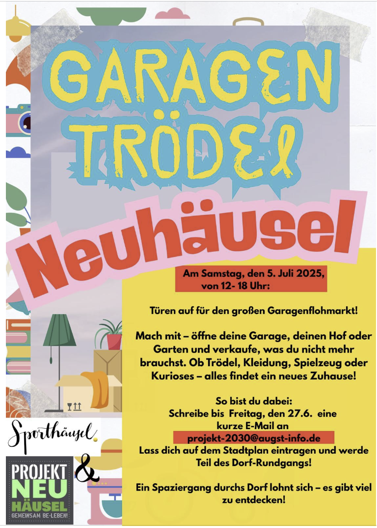 Mach mit – öffne deine Garage, deinen Hof oder Garten und verkaufe, was du nicht mehr brauchst. Ob Trödel, Kleidung, Spielzeug oder Kurioses – alles findet ein neues Zuhause!