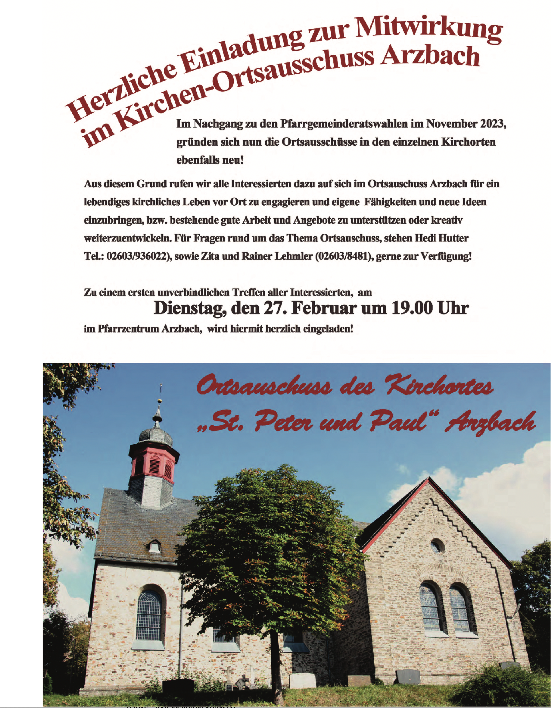 Aus diesem Grund rufen wir alle Interessierten dazu auf sich im Ortsauschuss Arzbach für ein lebendiges kirchliches Leben vor Ort zu engagieren und eigene Fähigkeiten und neue Ideen einzubringen, bzw. bestehende gute Arbeit und Angebote zu unterstützen oder kreativ weiterzuentwickeln.