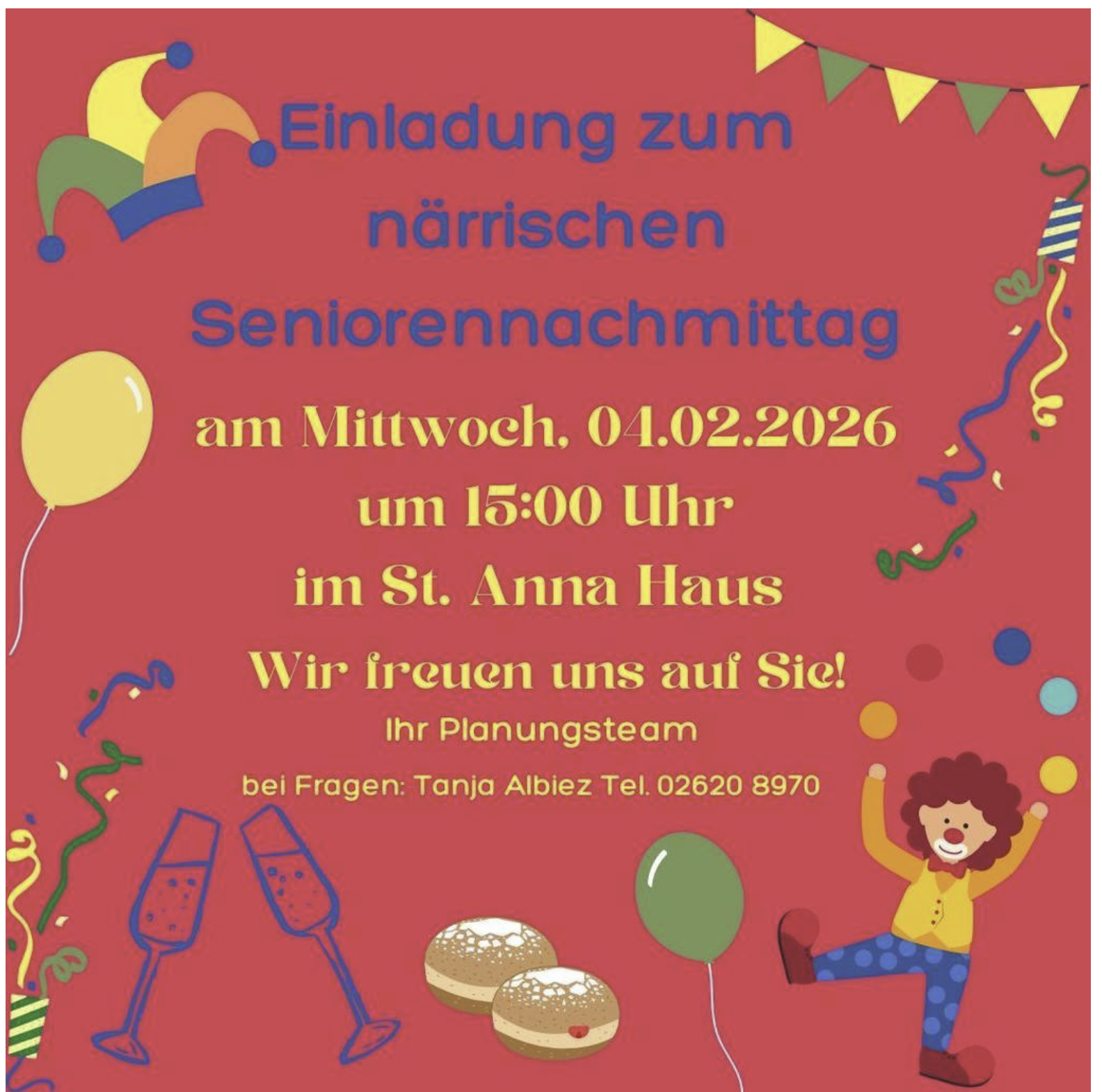 Einladung zum närrischen Seniorennachmittag am Mittwoch. 04.02.2026 um 15:00 Uhr im St. Anna-Haus