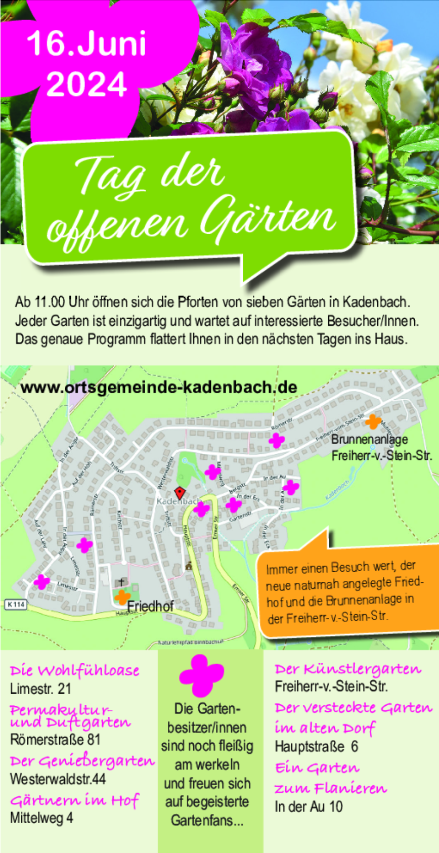 Wir freuen uns: Sieben Gartenbesitzer/Innen haben sich mit tollen Ideen gemeldet Ab 11.00 Uhr am 16. Juni öffnen sich die Pforten von sieben Gärten in Kadenbach. Jeder Garten ist einzigartig und wartet auf interessierte Besucher/Innen. Das genaue Programm flattert Ihnen in den nächsten Tagen ins Haus.