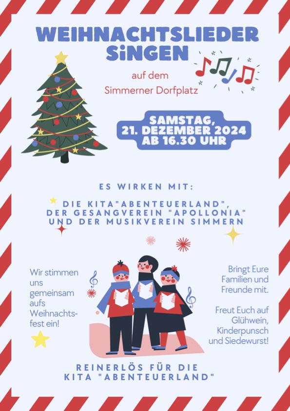 Am Samstag, 21.12.24, 16.30 Uhr, möchten wir uns mit allen kleinen und großen Besuchern auf das bevorstehende Fest einstimmen. Bekannte Weihnachtslieder wie „O Tannenbaum“, „O du fröhliche“, etc. werden die Herzen wärmen und lassen uns in die zauberhafte Welt der Weihnachtsklänge eintauchen. Für das leibliche Wohl ist mit Glühwein, Punsch, Bier etc. und Siedewurst bestens gesorgt. Die musikalische Veranstaltung ist von 16.30 Uhr bis 18.00 Uhr geplant. Der Reinerlös der Veranstaltung geht zu Gunsten der KITA „Abenteuerland“. Lasst uns gemeinsam singen, musizieren und den Zauber der Weihnachtszeit erleben!