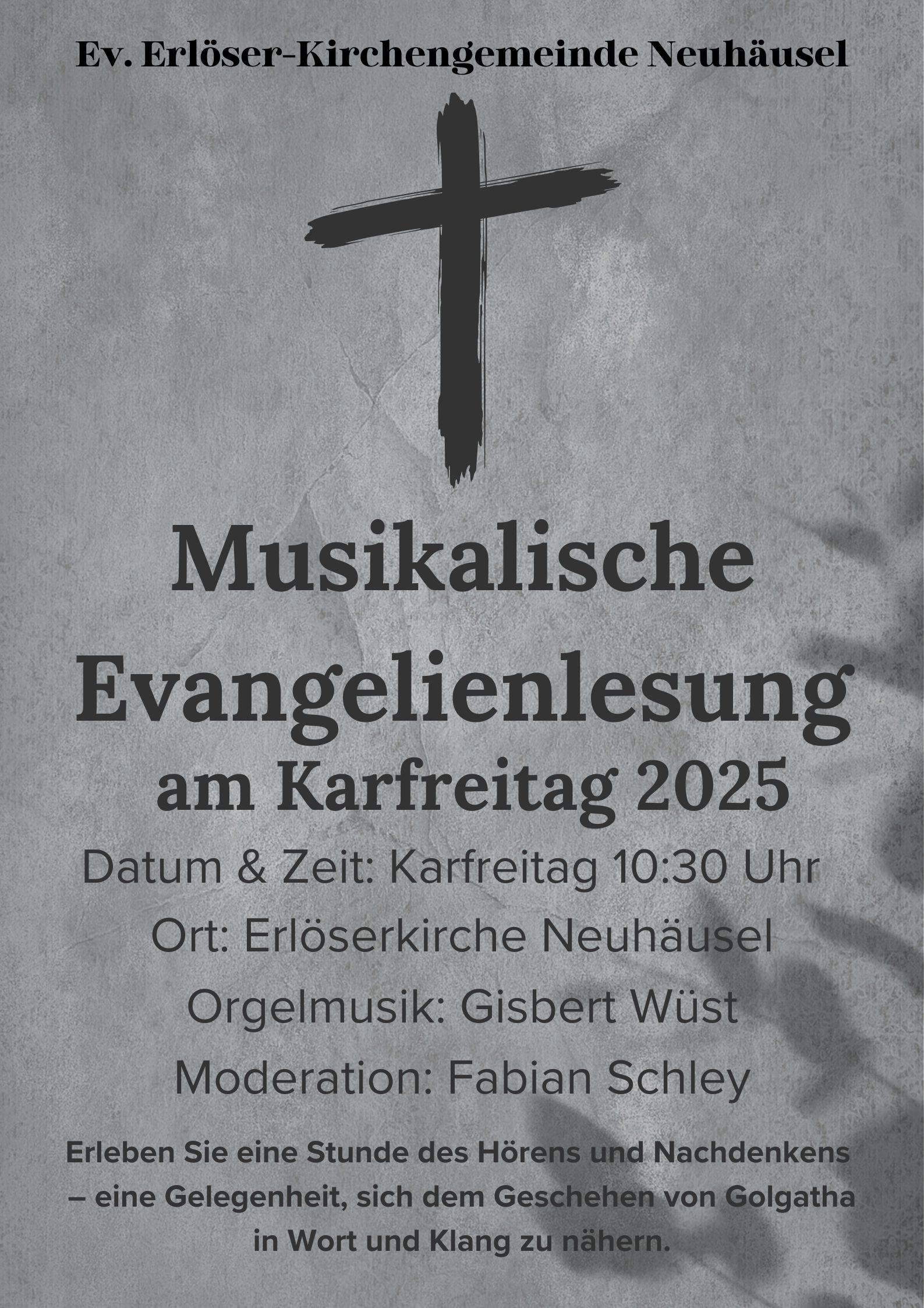 Die Evangelische Erlöser-Kirchengemeinde Neuhäusel lädt am Karfreitag 2025 um 10:30 Uhr zu einer besonderen Lesung der Passionsgeschichte nach Matthäus ein, begleitet von Werken Johann Sebastian Bachs. Wort und Musik verbinden […]