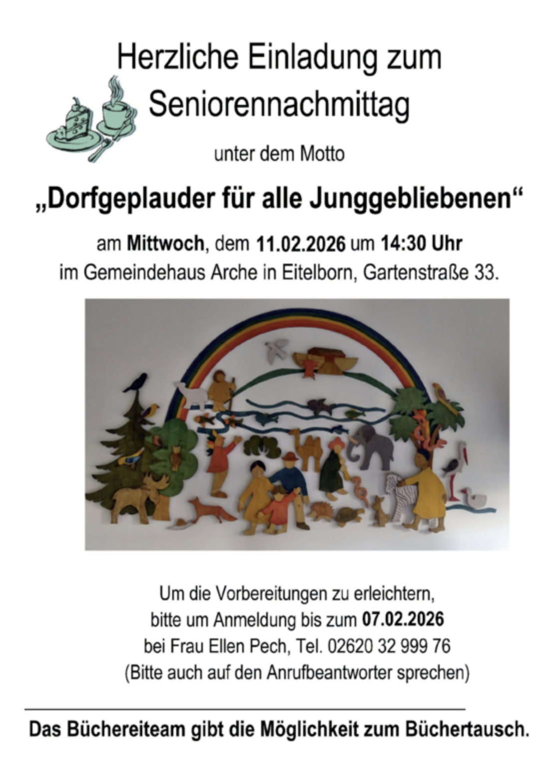 Gemeindehaus die Arche EitelbornUm die Vorbereitungen zu erleichtern, bitte um Anmeldung bis zum 07.02.2026 bei Frau Ellen Pech, Tel. 02620 32 999 76 (Bitte auch auf den Anrufbeantworter sprechen) Das Büchereiteam gibt die Möglichkeit […]