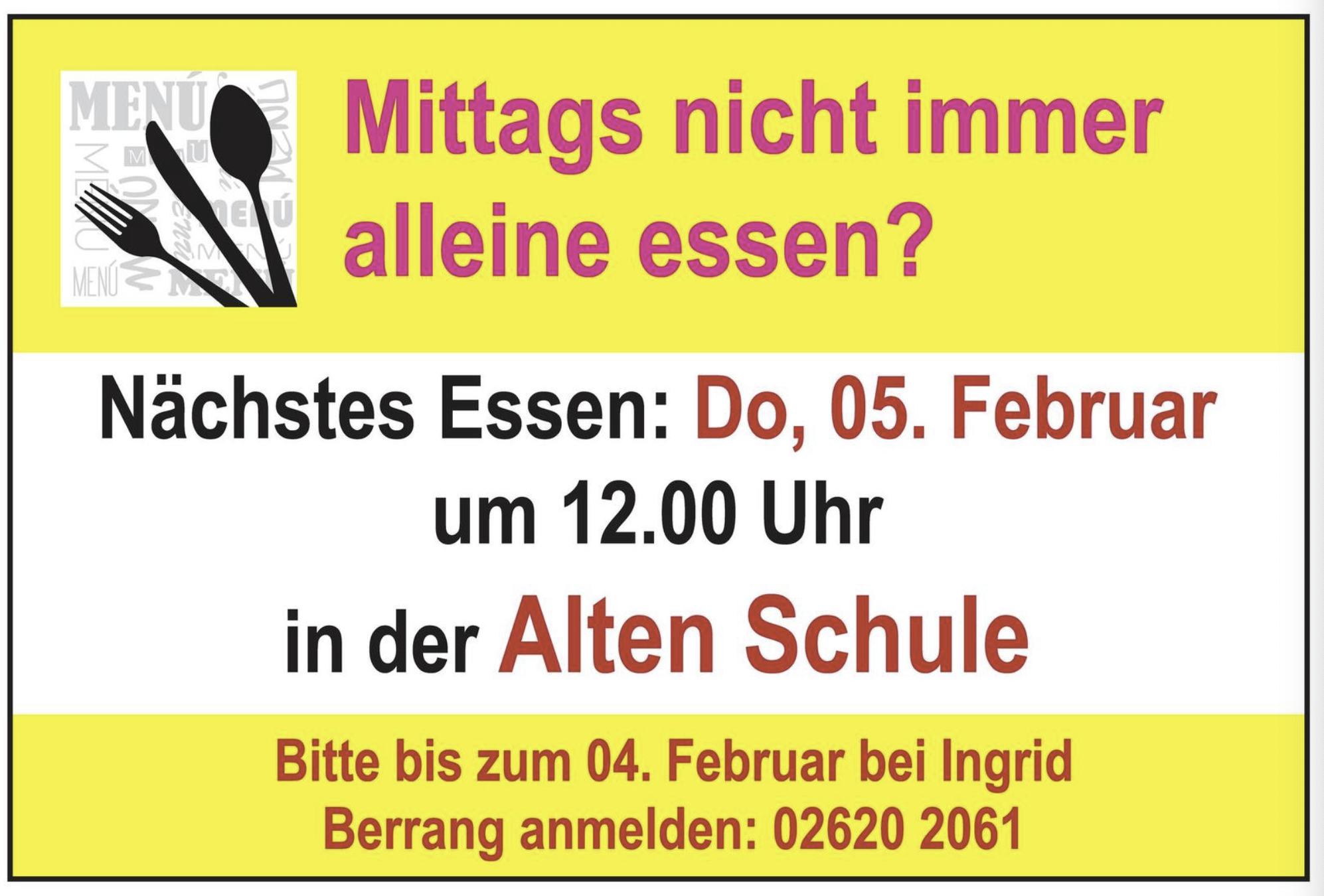 ‚Alte Schule“ Hauptstraße 28a, KadenbachBitte bis zum 04. Februar bei Ingrid Berrang anmelden: 02620 2061