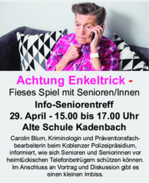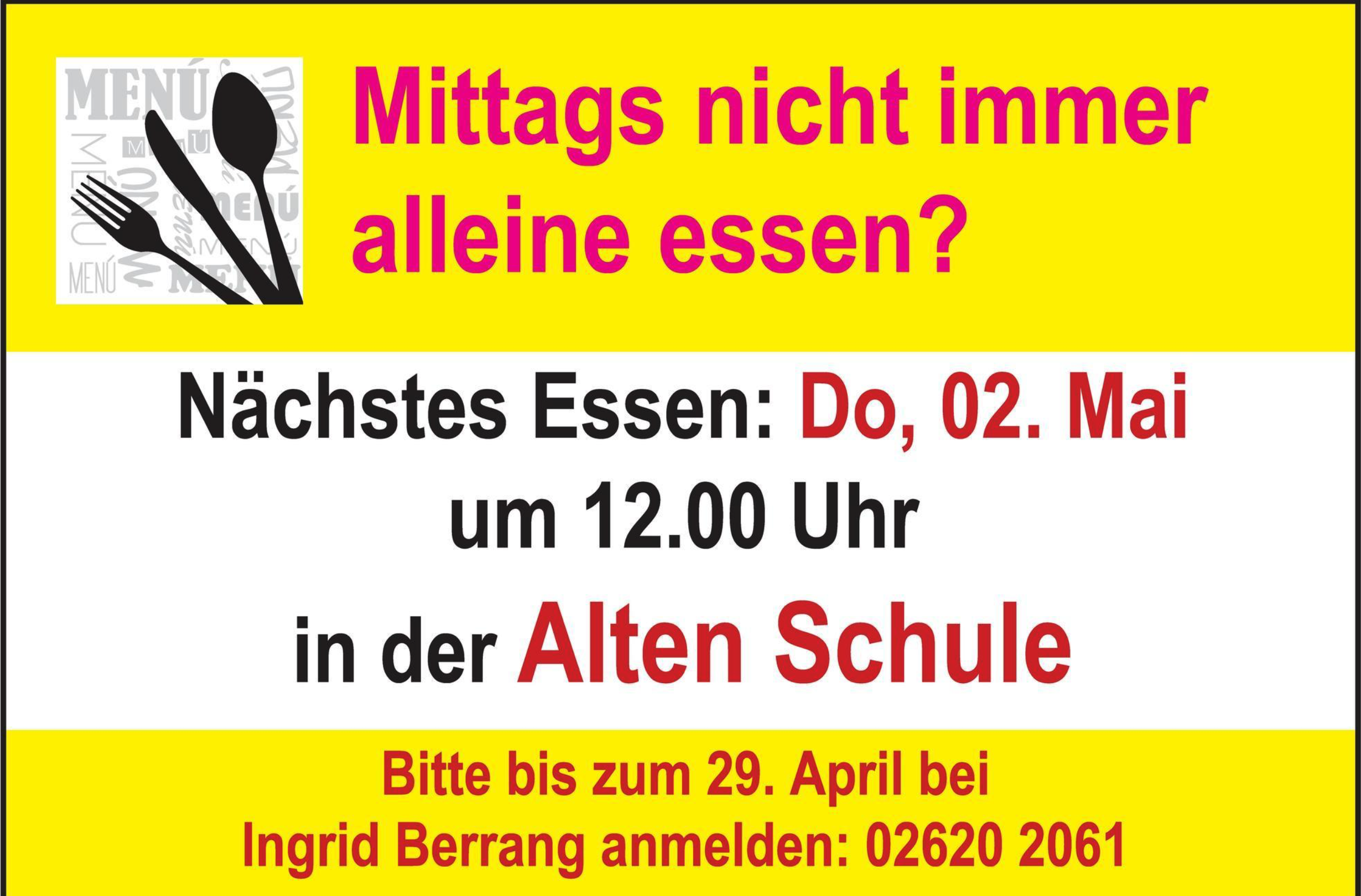 ‚Alte Schule“ Hauptstraße 28a, KadenbachBitte bis zum 29. April bei Ingrid Berrang anmelden: 02620 2061