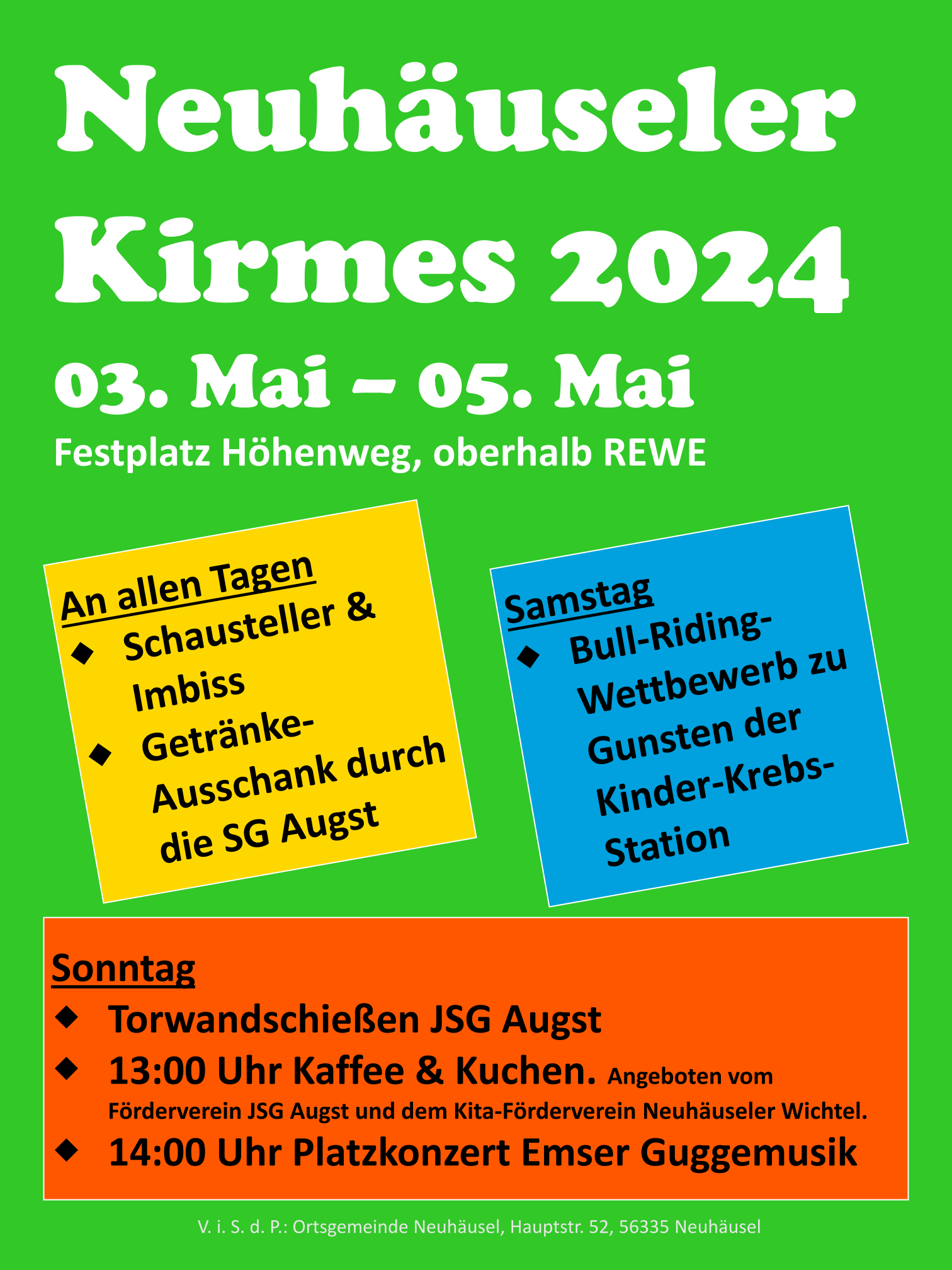 Festplatz Höhenweg oberhalb REWE, NeuhäuselAn allen Tagen • Schausteller & Imbiss, Getränke-Ausschank durch SG Augst Samstag: • 17:00 Uhr Kirmesmesse mit dem Kirchenchor in der kath. Sankt-Anna-Kirche • Ca. 17:00 Uhr – max. 22:00 […]