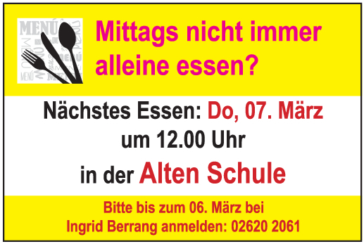 Herzliche Einladung zum Seniorennachmittag unter dem Motto „Dorfgeplauder für alle Junggebliebenen“ am Mittwoch, dem 13.03.2024 um 14:30 Uhr im Gemeindehaus Arche in Eitelborn, Gartenstraße 33. Um die Vorbereitungen zu erleichtern, bitte um Anmeldung bis zum 10.03.2024 bei Frau Ellen Pech, Tel. 02620 32 999 76 (Bitte auch auf den Anrufbeantworter sprechen) Das Büchereiteam gibt die […] |