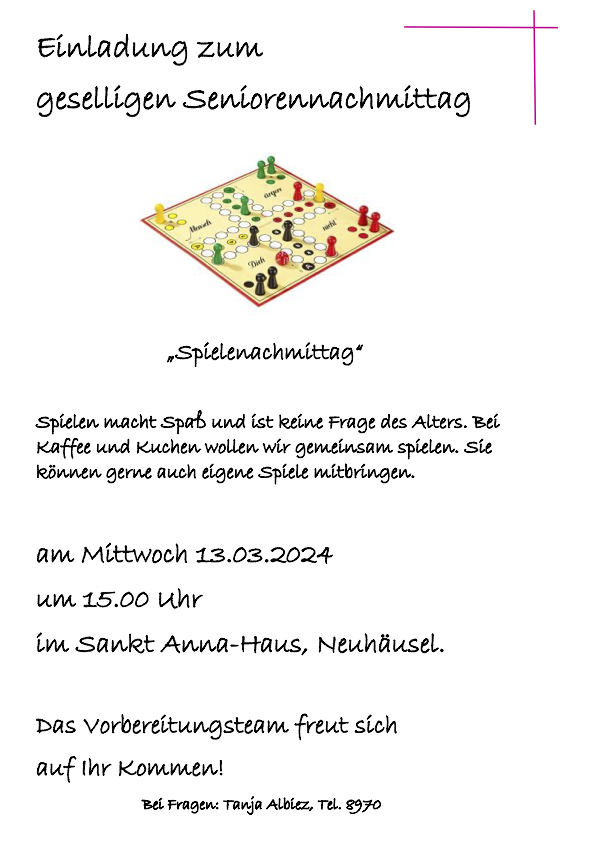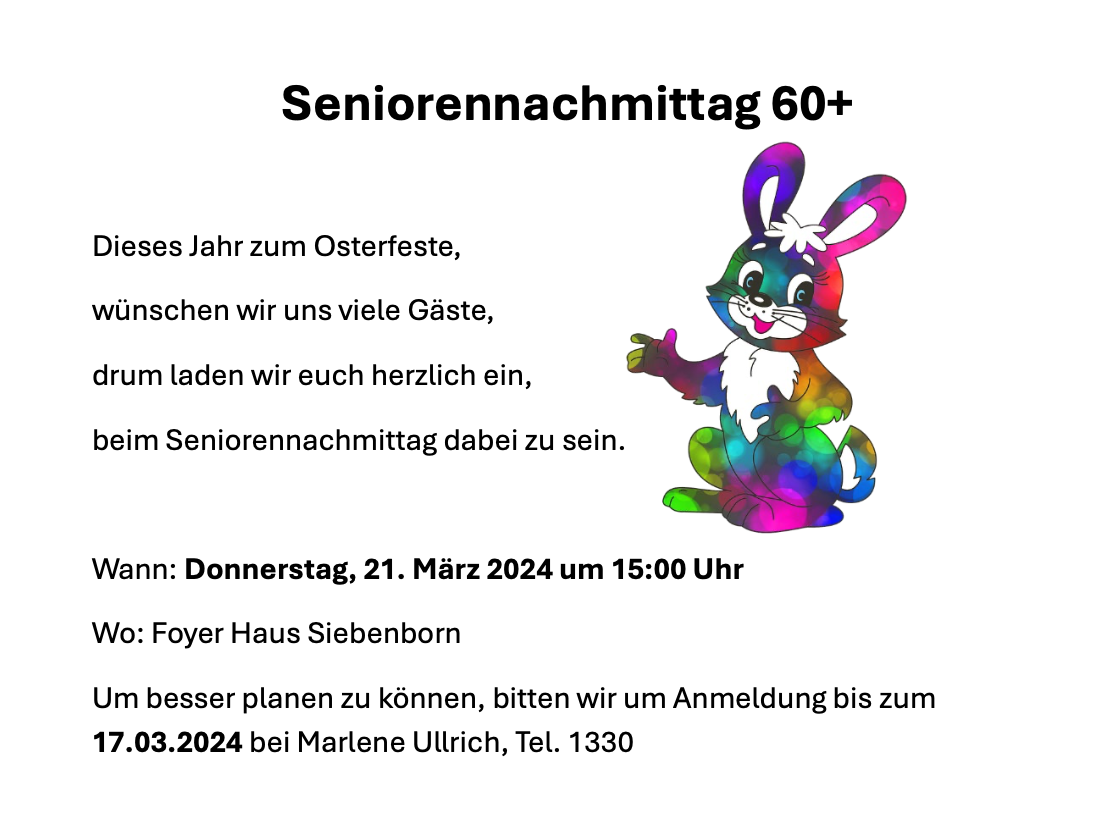 Dieses Jahr zum Osterfeste, wünschen wir uns viele Gaste, drum laden wir euch herzlich ein, beim Seniorennachmittag dabei zu sein. Wann: Donnerstag, 21. März 2024 um 15:00 Uhr Wo: Foyer Haus Siebenborn Um besser planen zu können, bitten wir um Anmeldung bis zum 17.03.2024 bei Marlene Ullrich, Tel. 1330