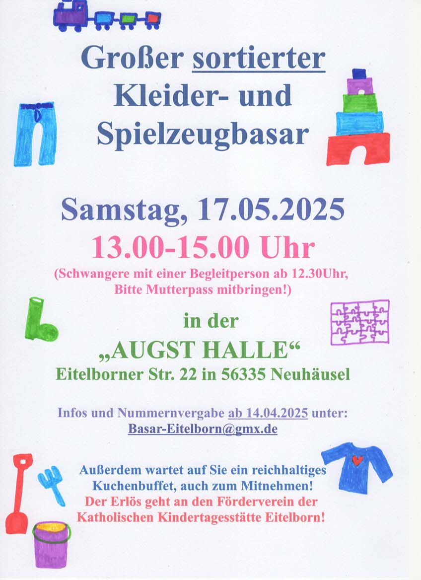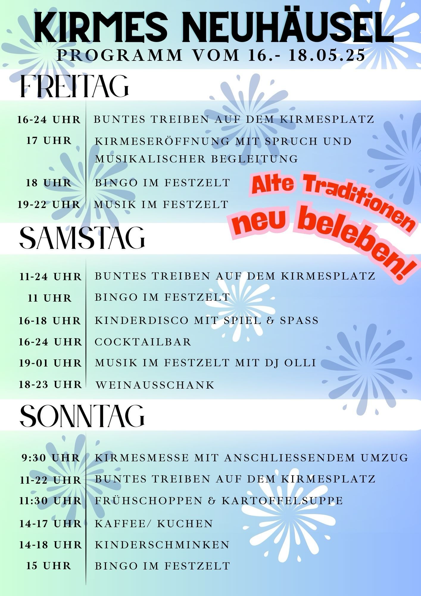 Liebe Neuhäuseler, ganz nach dem Motto „Alte Traditionen neu beleben“ wird es in diesem Jahr auch wieder einen Kirmesumzug geben. Alle Kinder des Dorfes sind eingeladen nach der Kirmesmesse (kath. Kirche) am Sonntag den 18.05.2025 gegen 10:15 Uhr mit ihren geschmückten Fahrrädern, Rollern, Laufrädern, Kinderwagen… begleitet von Musik quer durch das Dorf zum Kirmesplatz zu […]