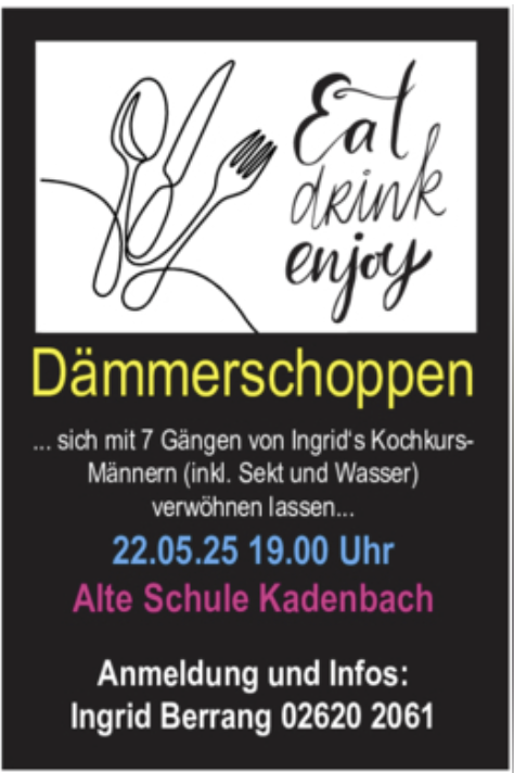 Herzliche Einladung zum Seniorennachmittag unter dem Motto „Dorfgeplauder für alle Junggebliebenen“ Mittwoch, dem 09.04.2025 um 14:30 Uhr im Gemeindehaus Arche in Eitelborn, Gartenstraße 33. Um die Vorbereitungen zu erleichter, bitte um Anmeldung bis zum 05.04.2025 bei Frau Ellen Pech, Tel. 02620 32 999 76 (Bitte auch auf den Anrufbeantworter sprechen). Das Büchereiteam gibt die Möglichkeit […]