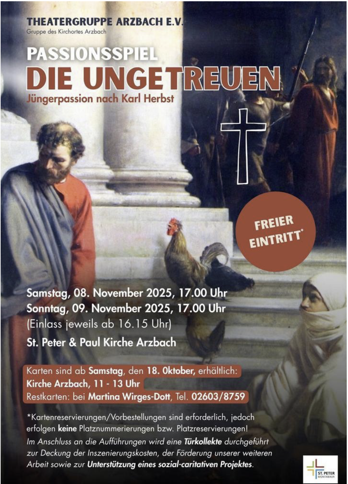 Karten sind ab Samstag, den 18. Oktober, erhältlich: Kirche Arzbach, 11 – 13 Uhr Restkarten: bei Martina Wirges-Dott, Tel. 02603/8759 *Kartenreservierungen/Vorbestellungen sind erforderlich, jedoch erfolgen keine Platznummerierungen bzw. Platzreservierungen! Im Anschluss an die Aufführungen wird eine Türkollekte durchgeführt zur Deckung der Inszenierungskosten, der Förderung unserer weiteren Arbeit sowie zur Unterstützung eines sozial-caritativen Projektes. Einlass jeweils […] |