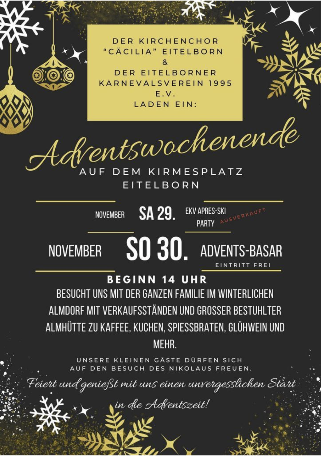 Gemeinsam verwandeln die Eitelborner Karnevalsverein und der Kirchenchor „Cäcilia“ den Kirmesplatz am 1. Advents-Wochenende in ein funkelndes winterliches Almdorf mit festlicher Beleuchtung, uriger Atmosphäre und jeder Menge Unterhaltung. Den Auftakt macht am Samstag, 28. November, der EKV mit einer großen Aprés-Ski-Party in der Almhütte. Der Run auf die begehrten Karten war riesig – binnen weniger […]