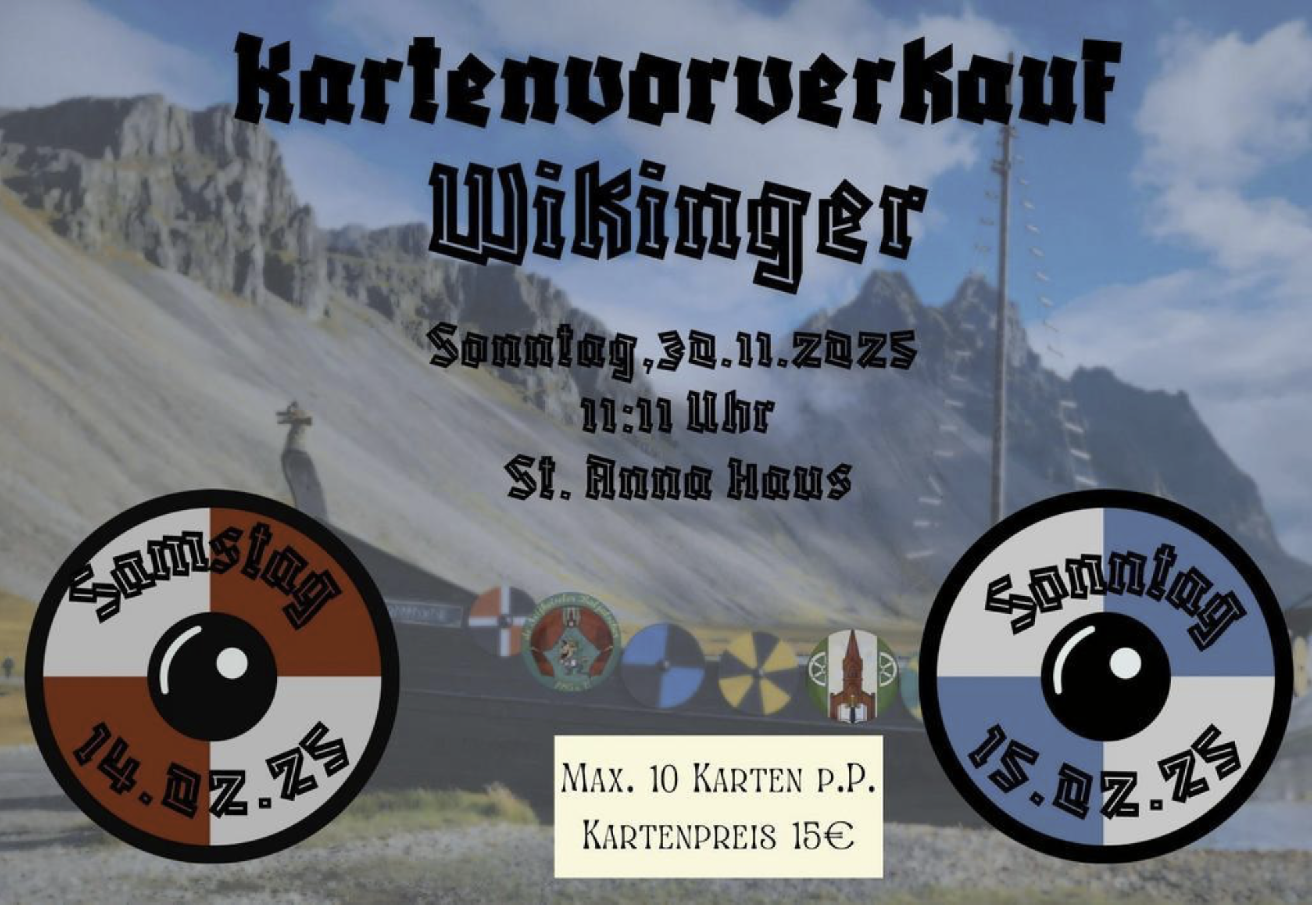 Im Sturm der Nacht, im Fackelschein – wir Wikinger wollen närrisch sein. Kartenvorverkauf für die Sitzungen am 14. und 15.2.26 ist am 30.11.25 um 11.11 Uhr im St. Anna Haus. Wichtiger Hinweis! Aufgrund der großen Nachfrage werden nur noch 10 Karten pro Person abgegeben. Kartenpreis 15.- €