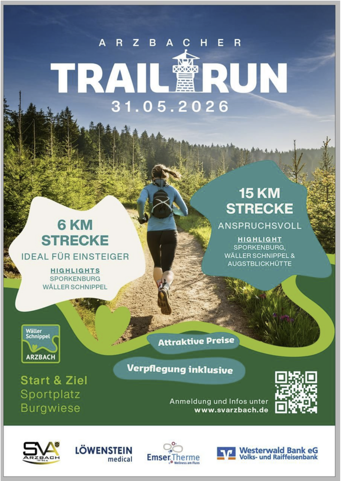 15 KM STRECKE ANSPRUCHSVOLL STRECKE HIGHLIGHT SPORKENBURG, WALLER SCHNIPPEL & AUGSTBLICKHÜTTE 6 KM STRECKE IDEAL FÜR EINSTEIGER HIGHLIGHTS SPORKENBURG, WÄLLER SCHNIPPEL Attraktive Preise Verpflegung inklusive Start & Ziel Sportplatz Anmeldung und Infos unter Burgwiese http://www.svarzbach.de |