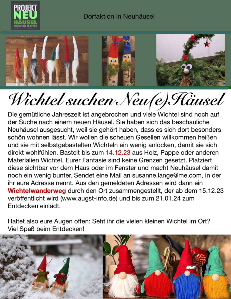 Jeder Bewohner und jede Bewohnerin unseres Dorfes ist darüber hinaus – unabhängig von der Teilnahme am Wichtelweg – herzlich dazu eingeladen, weitere Wichtel in den Vorgarten oder in das Fenster zu stellen.